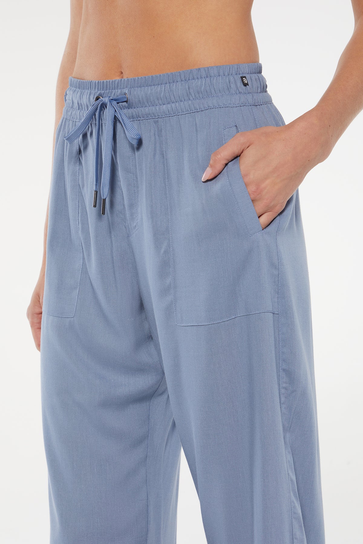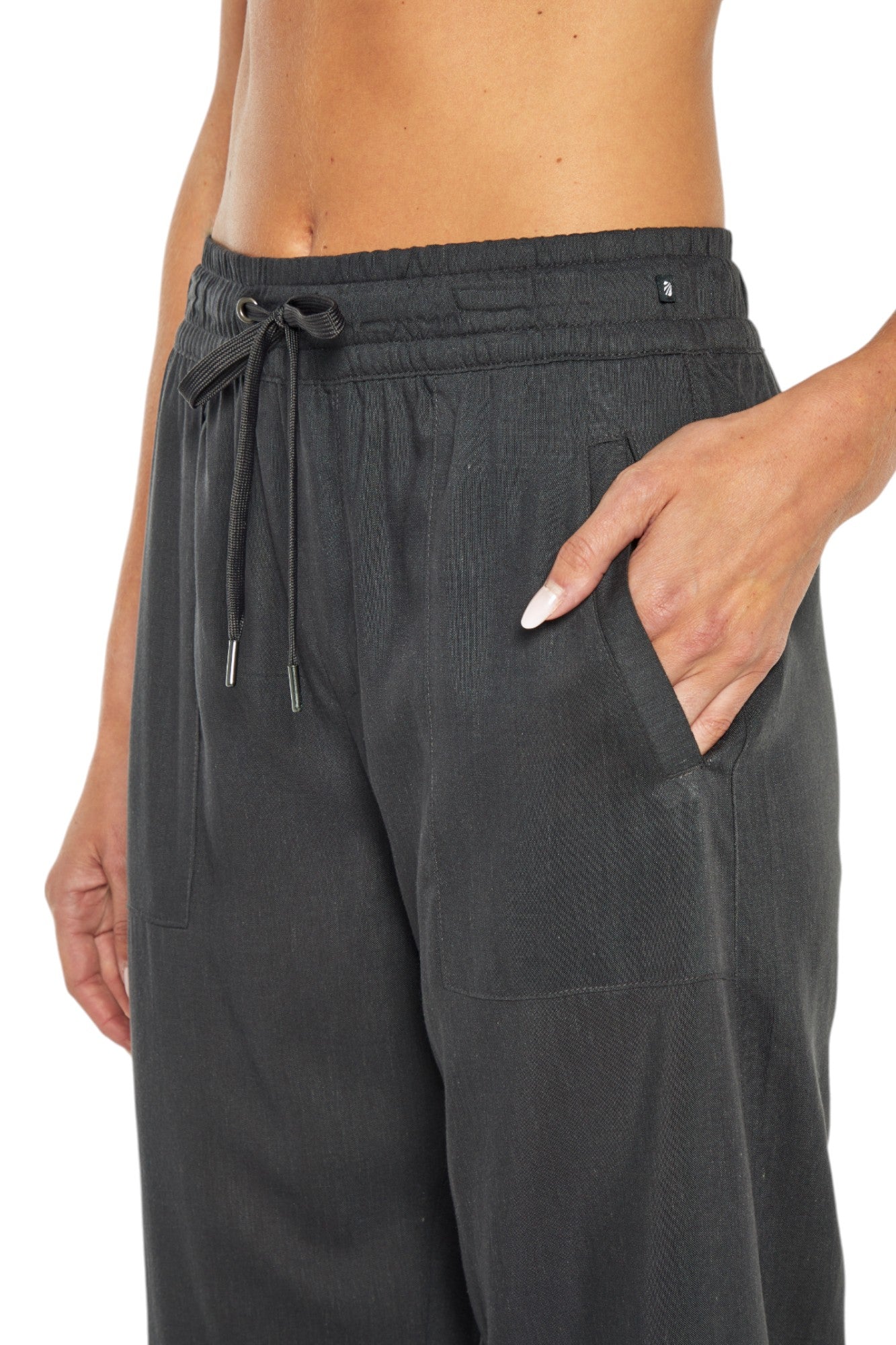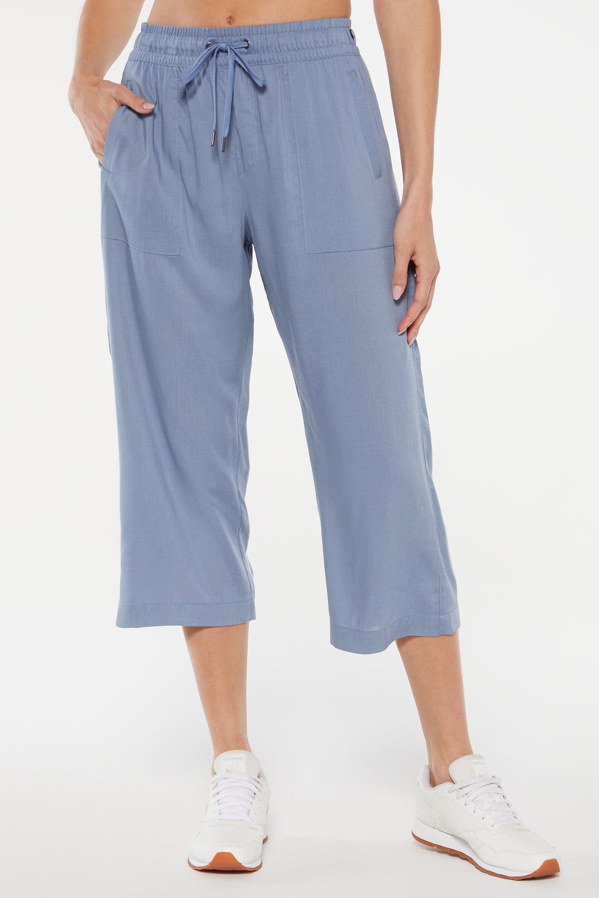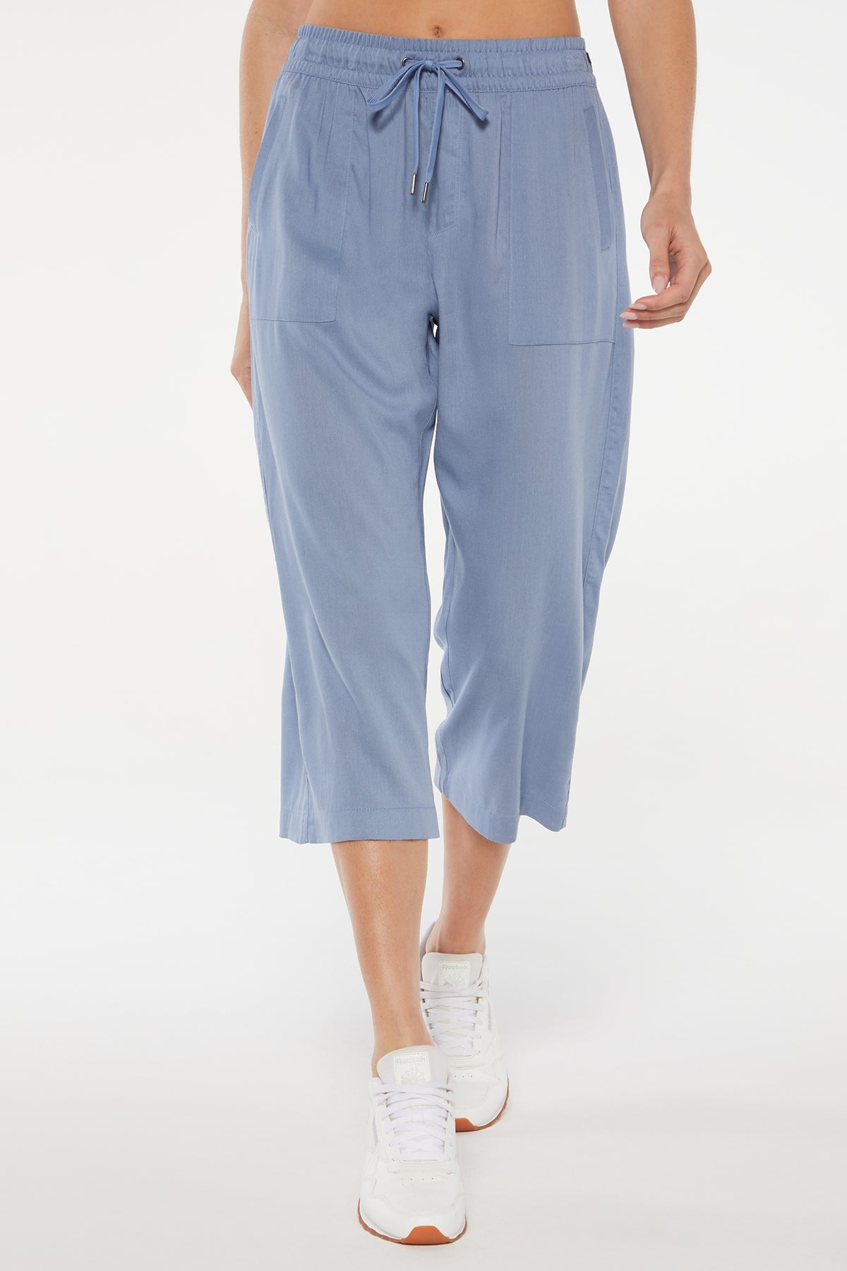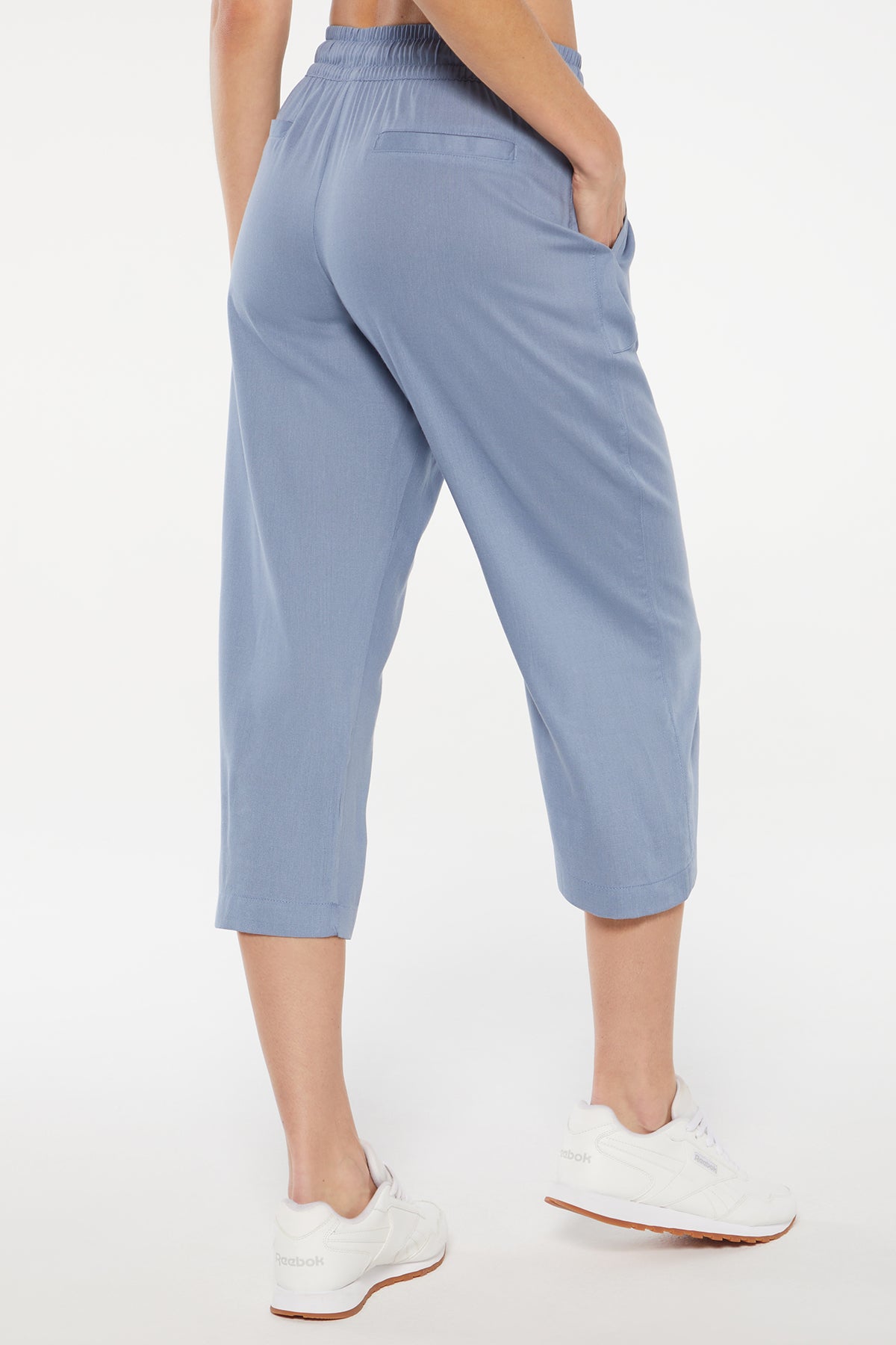 In a lightweight chambray fabric infused with a touch of linen, these cropped, loose-fit pants feature front patch pockets, faux rear pockets, a decorative fly, and an elasticized waistband with an adjustable, self-tie drawcord.