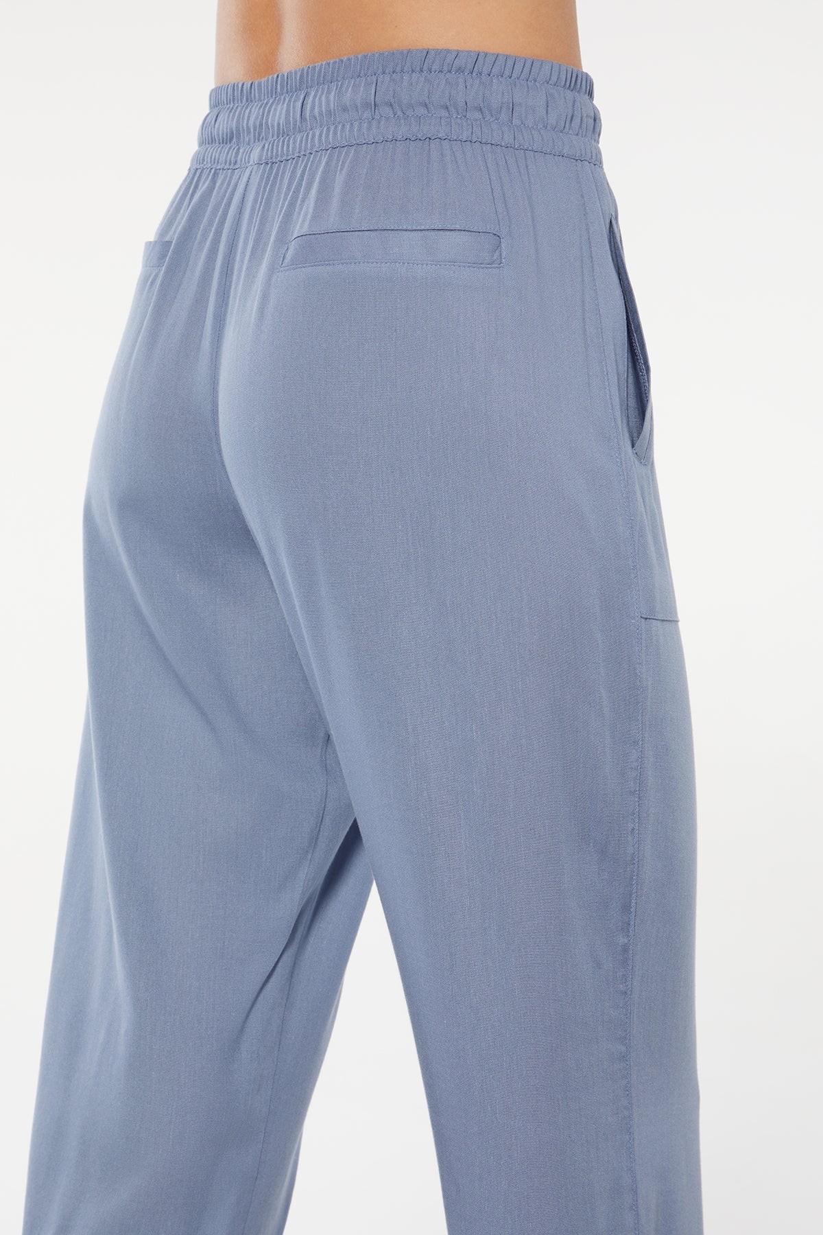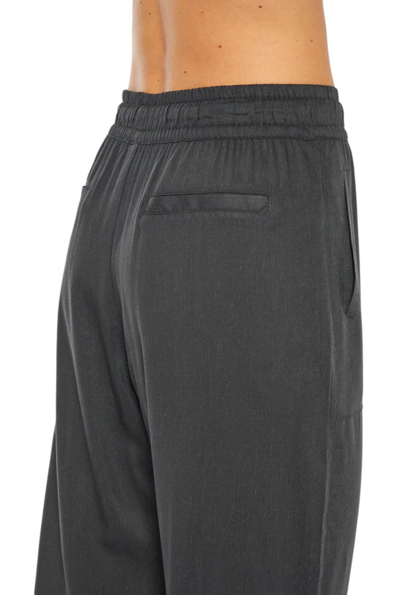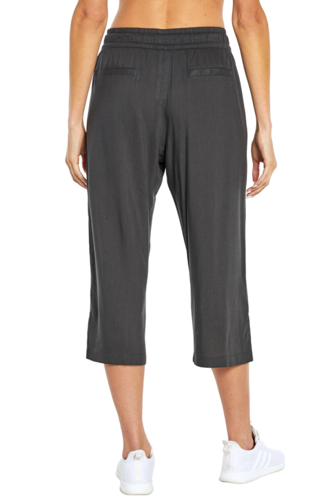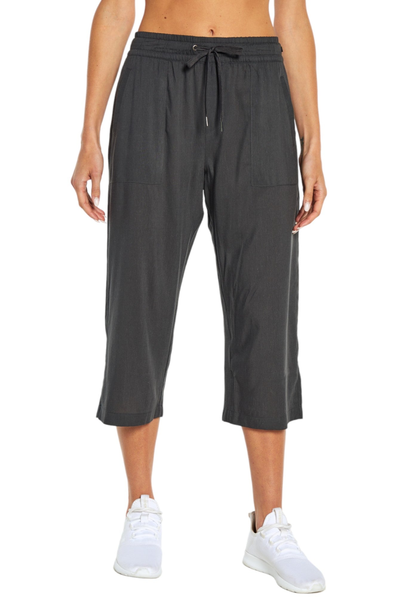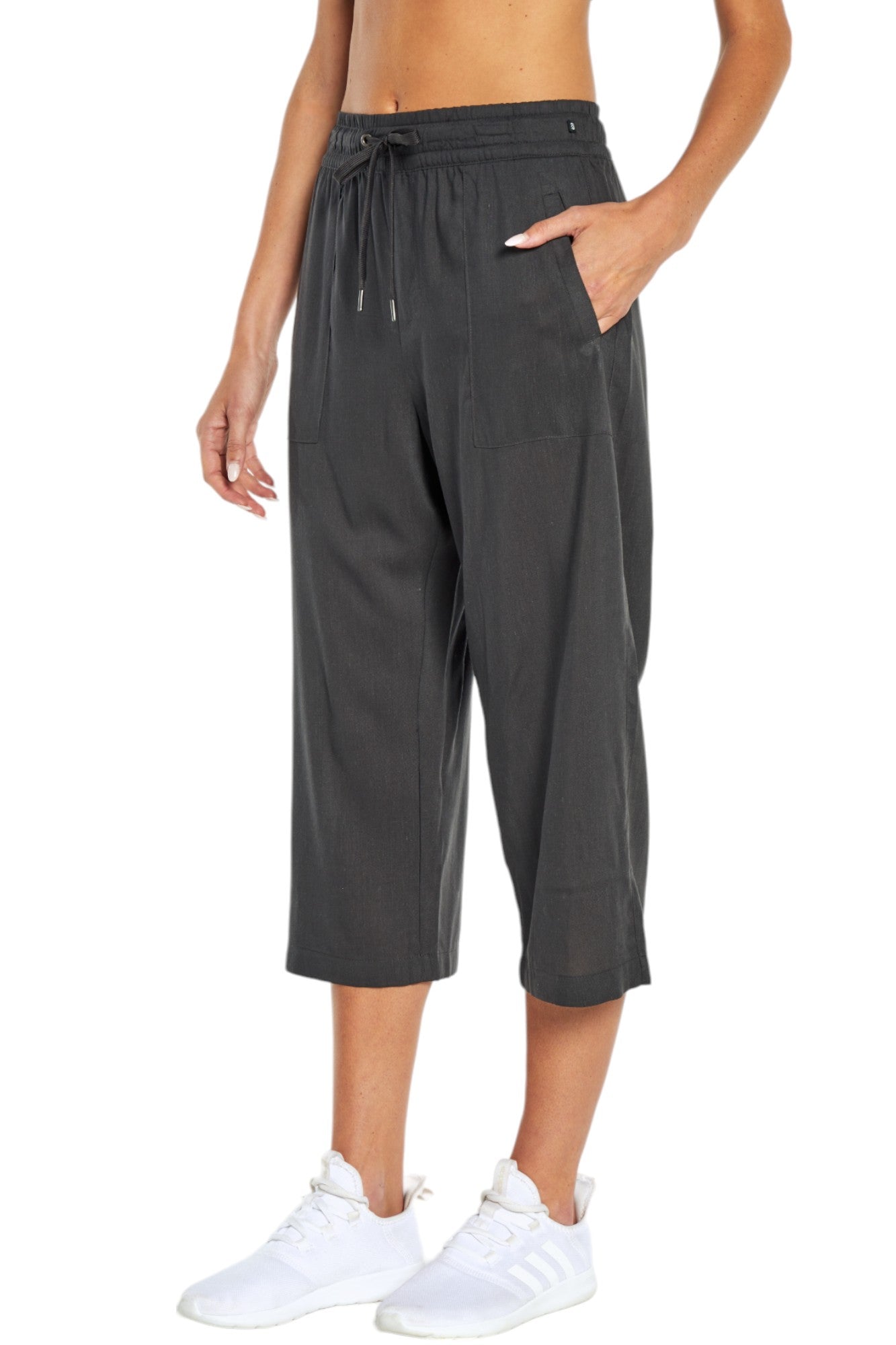 In a lightweight chambray fabric infused with a touch of linen, these cropped, loose-fit pants feature front patch pockets, faux rear pockets, a decorative fly, and an elasticized waistband with an adjustable, self-tie drawcord.