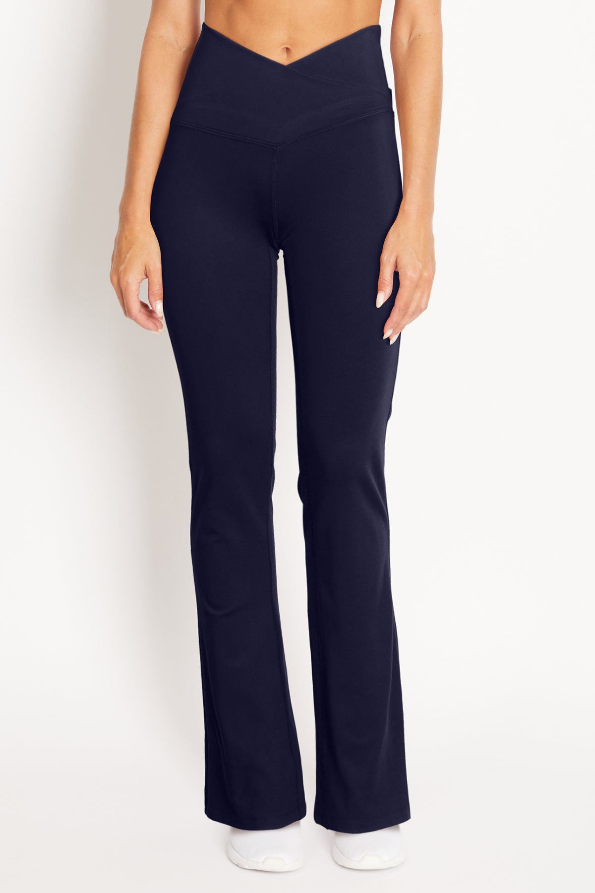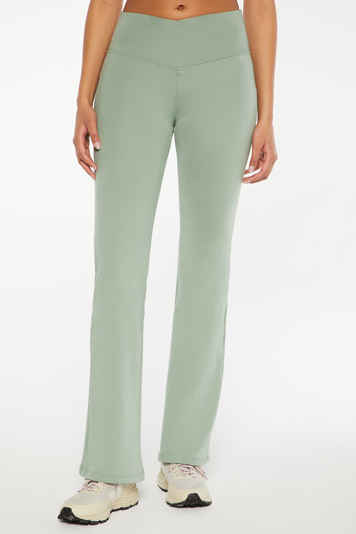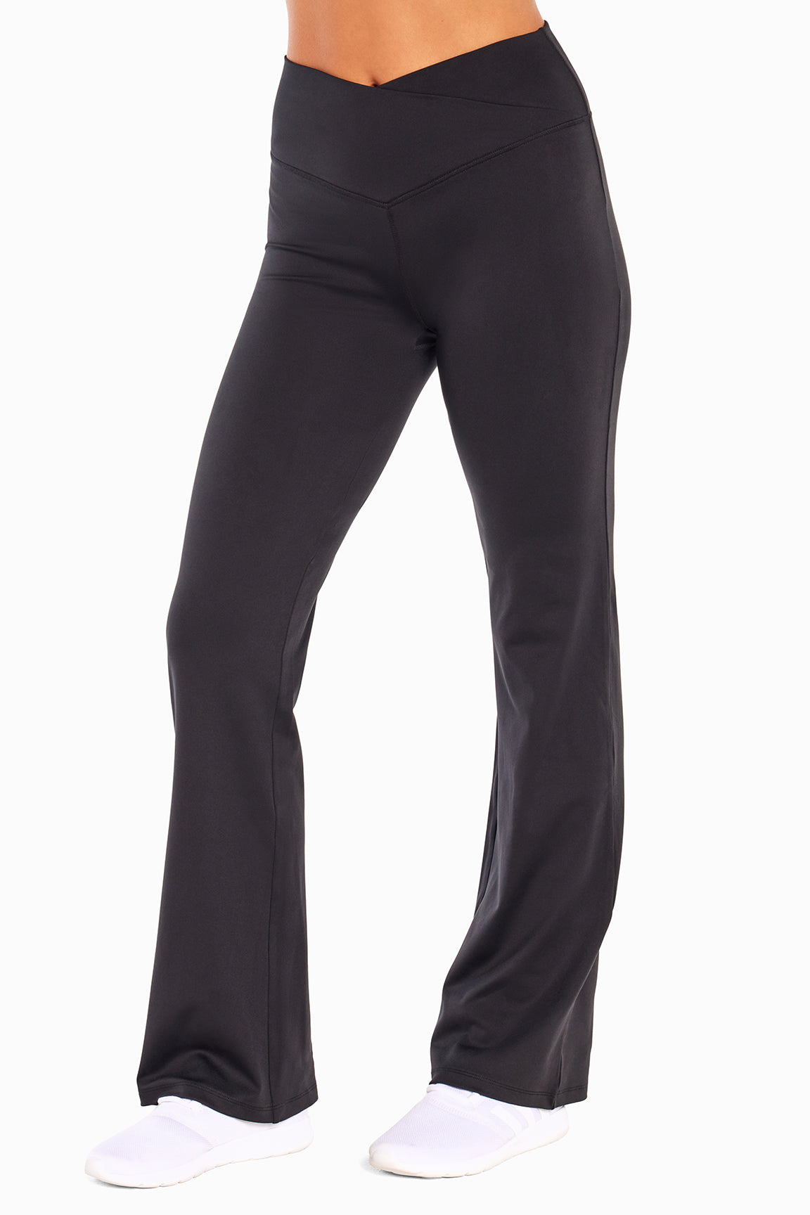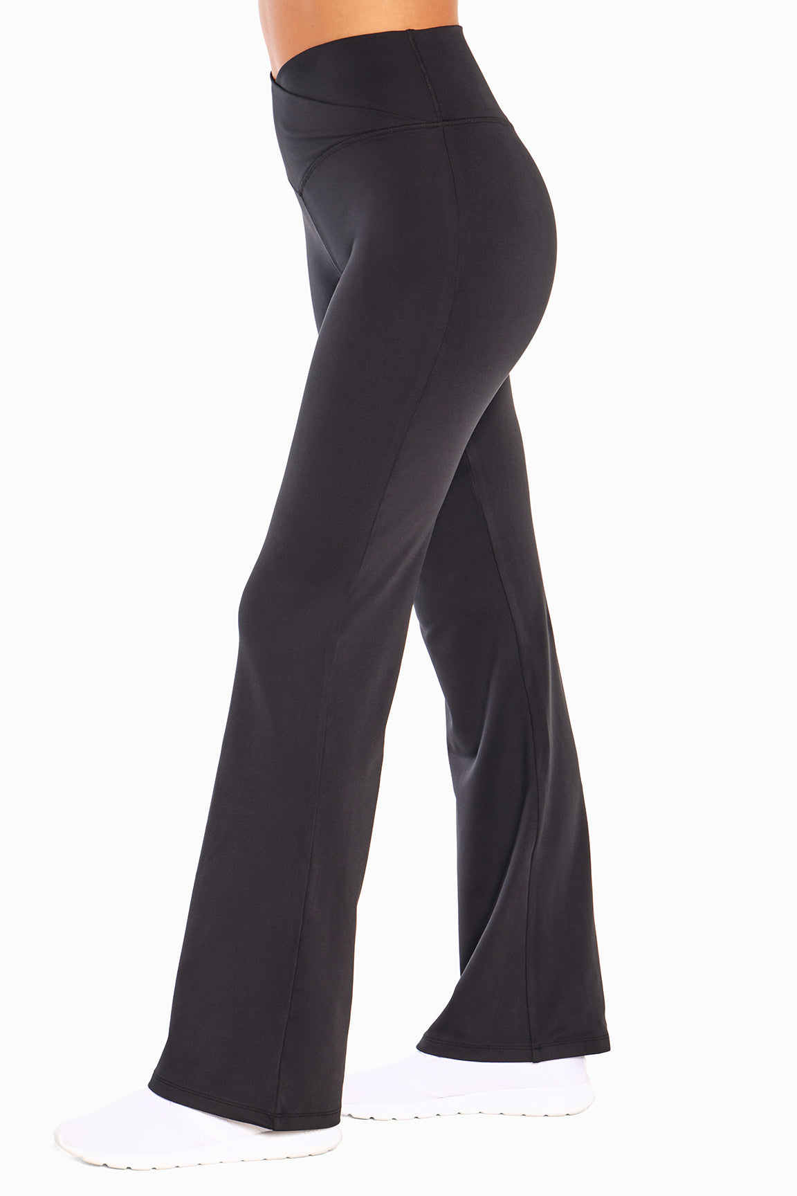 Cut from a breathable, soft-brushed fabric with moisture-wicking technology, this bootcut pant features a unique crossover waistband that won’t dig in and a flared, high-rise silhouette that flatters every body type.