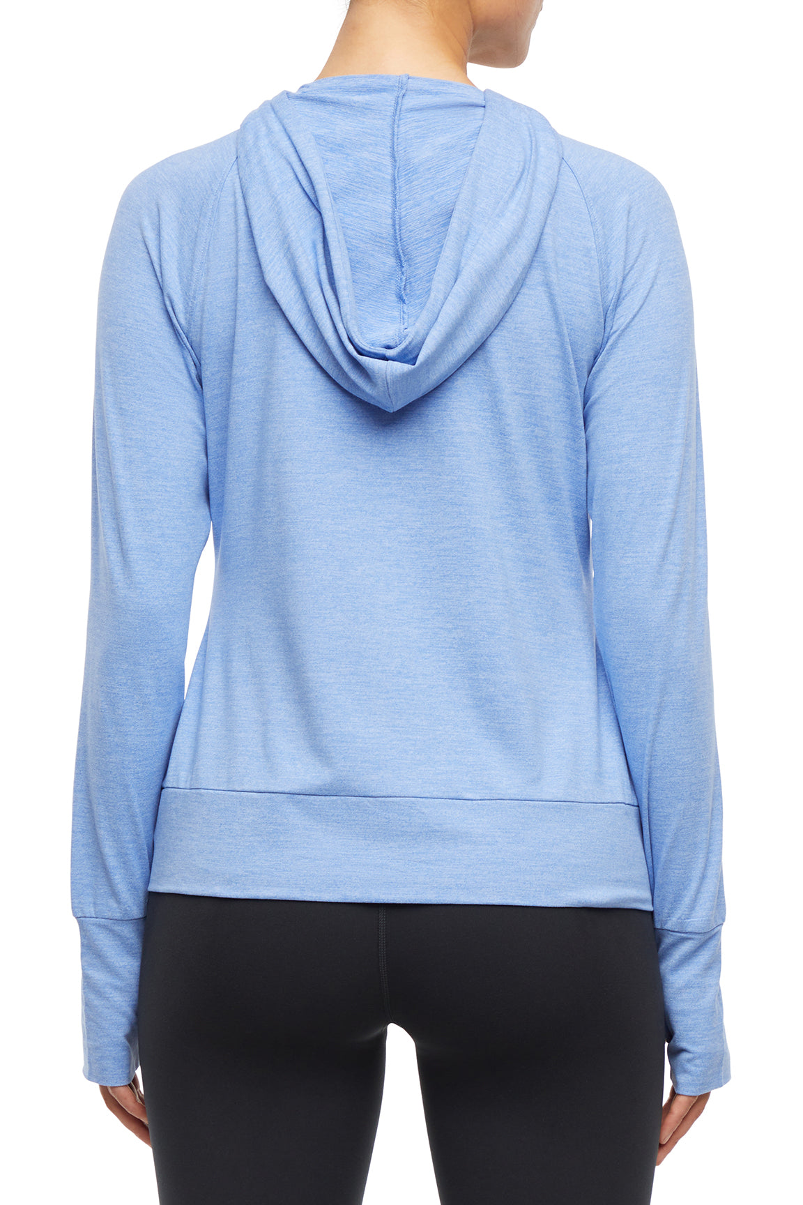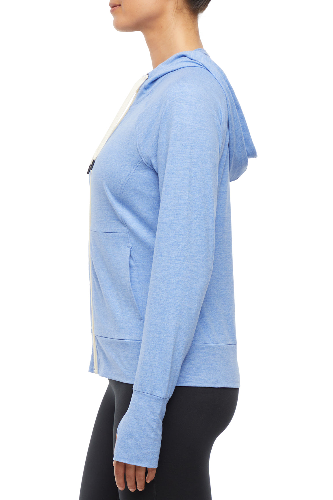 A slim-fit style for studio and street, this zip-front jacket is cut from heathered jersey, soft-brushed on both sides, with a functional drawcord hood, kangaroo pockets, and long sleeves with thumbholes.