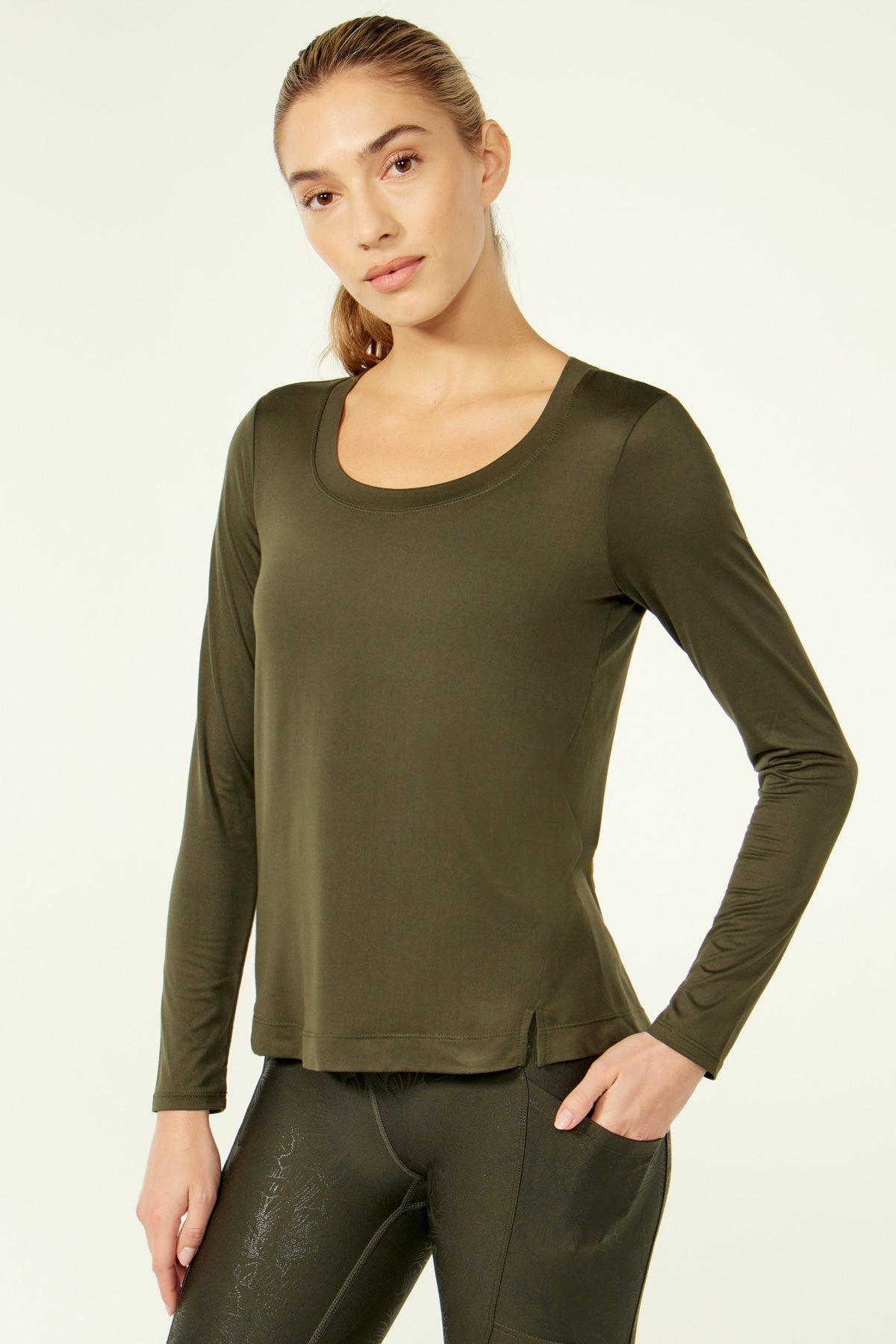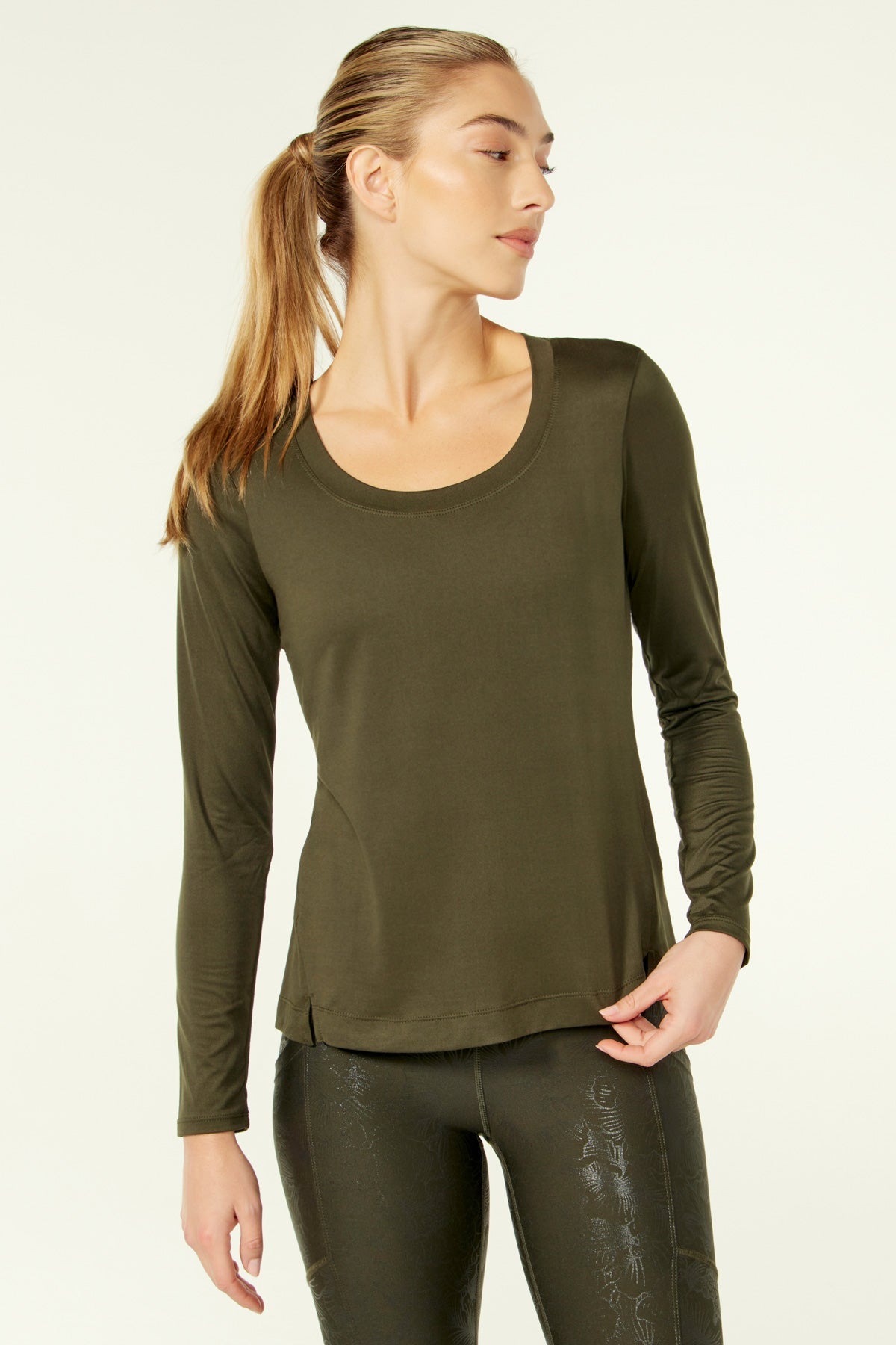 An active style with studio-to-street versatility, this long-sleeved top is cut from a soft, lightweight jersey, with a banded scoop neckline and notched side slits at the hem.