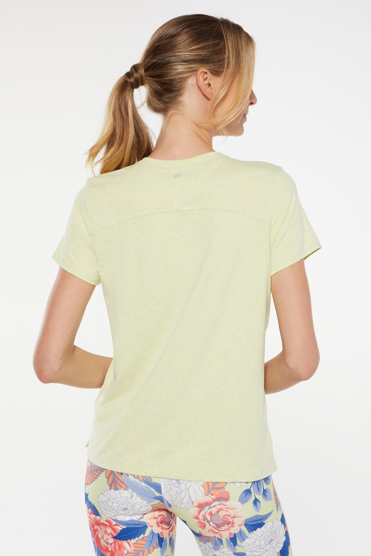 Brighten up your workout with this three-piece set in festive floral print – a heathered tee with brushed softness, a sweat-wicking bra with a cut-out back, and matching leggings with a crossover waistband.
