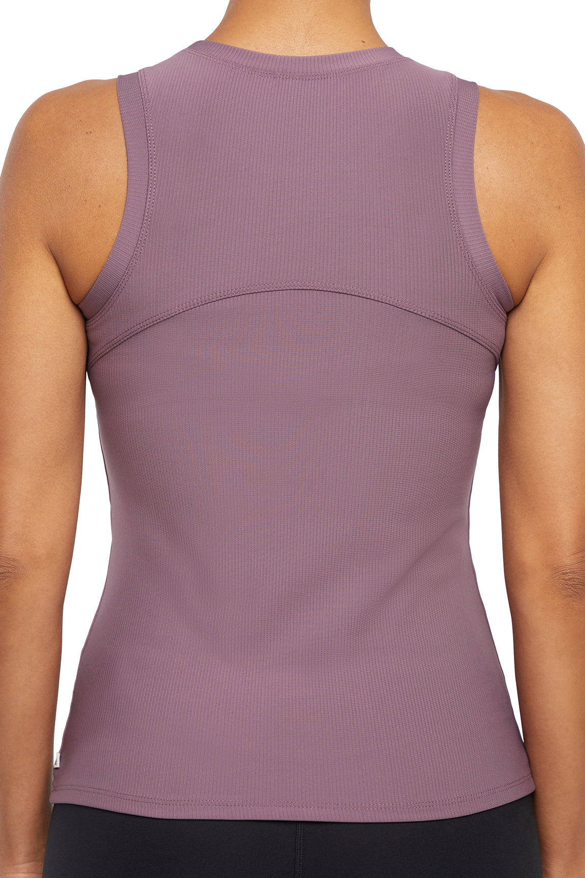 An everyday essential that goes from studio to street to sleek date night ensemble, this versatile rib knit tank top features a fitted silhouette, a classic crew neckline, banded armholes, and a curved back yoke.