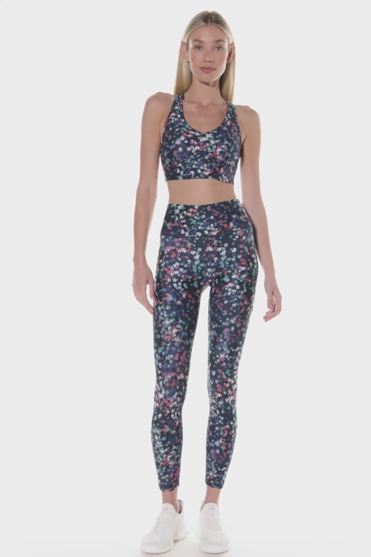 Watch your activewear collection blossom with the addition of this set – an ultra-soft top with princess seams, a racerback sports bra with a floral print, and matching tummy control leggings.