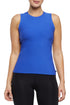 An everyday essential that goes from studio to street to sleek date night ensemble, this versatile rib knit tank top features a fitted silhouette, a classic crew neckline, banded armholes, and a curved back yoke.