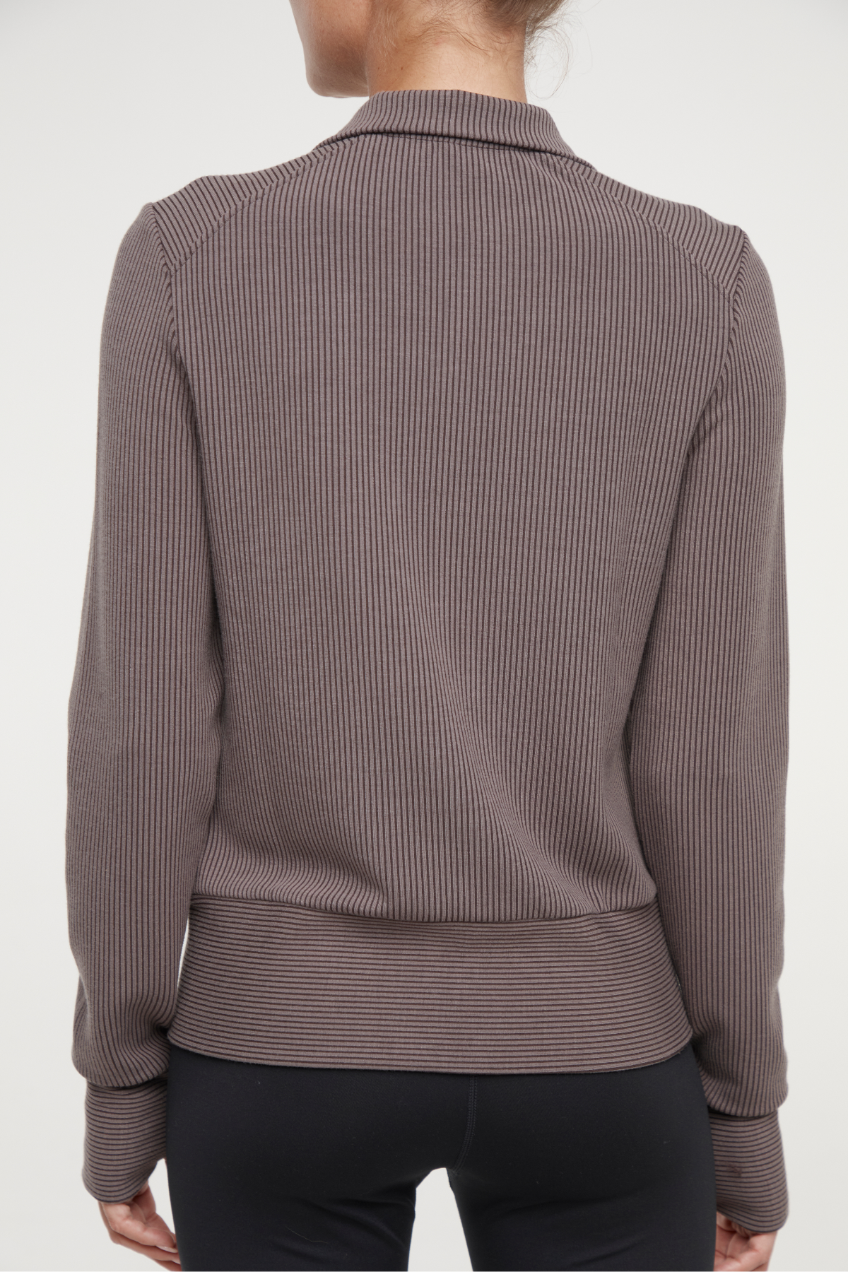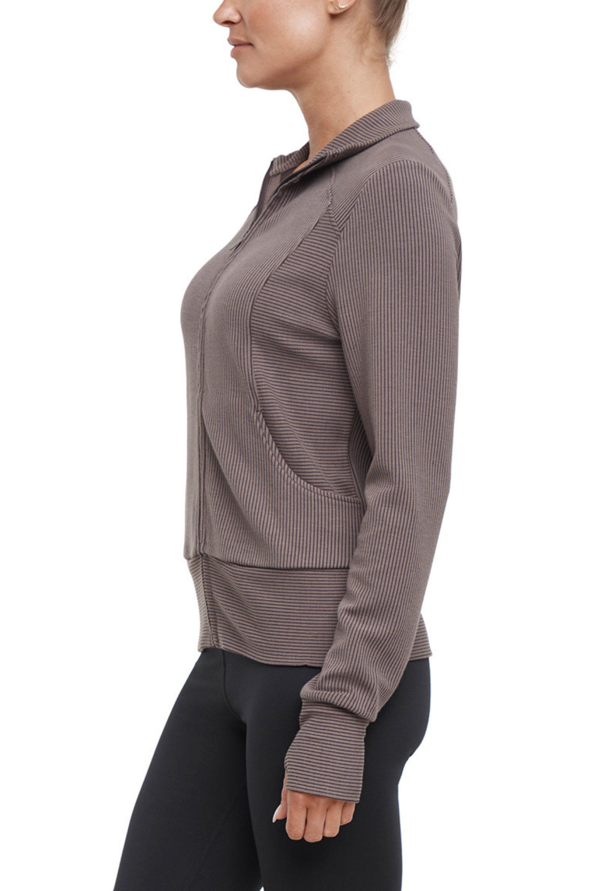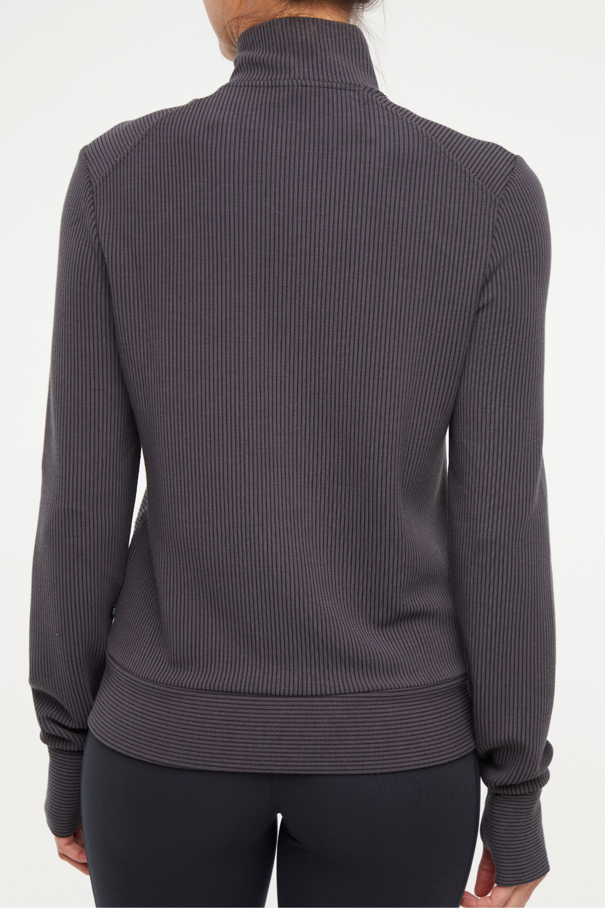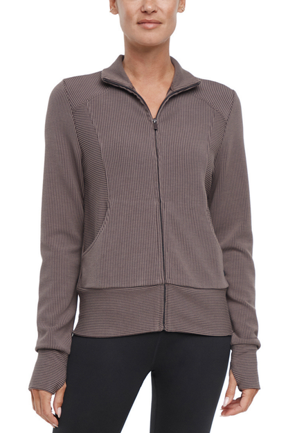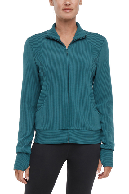 A relaxed fit cut from soft rib knit, this mockneck jacket features long sleeves with thumbhole cuffs, handy side pockets, and a full-length front zipper for easy on and off.