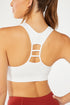 Cut from seam-free jacquard fabric for maximum comfort, this scoopneck sports bra features moisture-wicking capabilities and a narrow, cut-out racerback with laddered straps, for ease of movement at the gym.