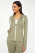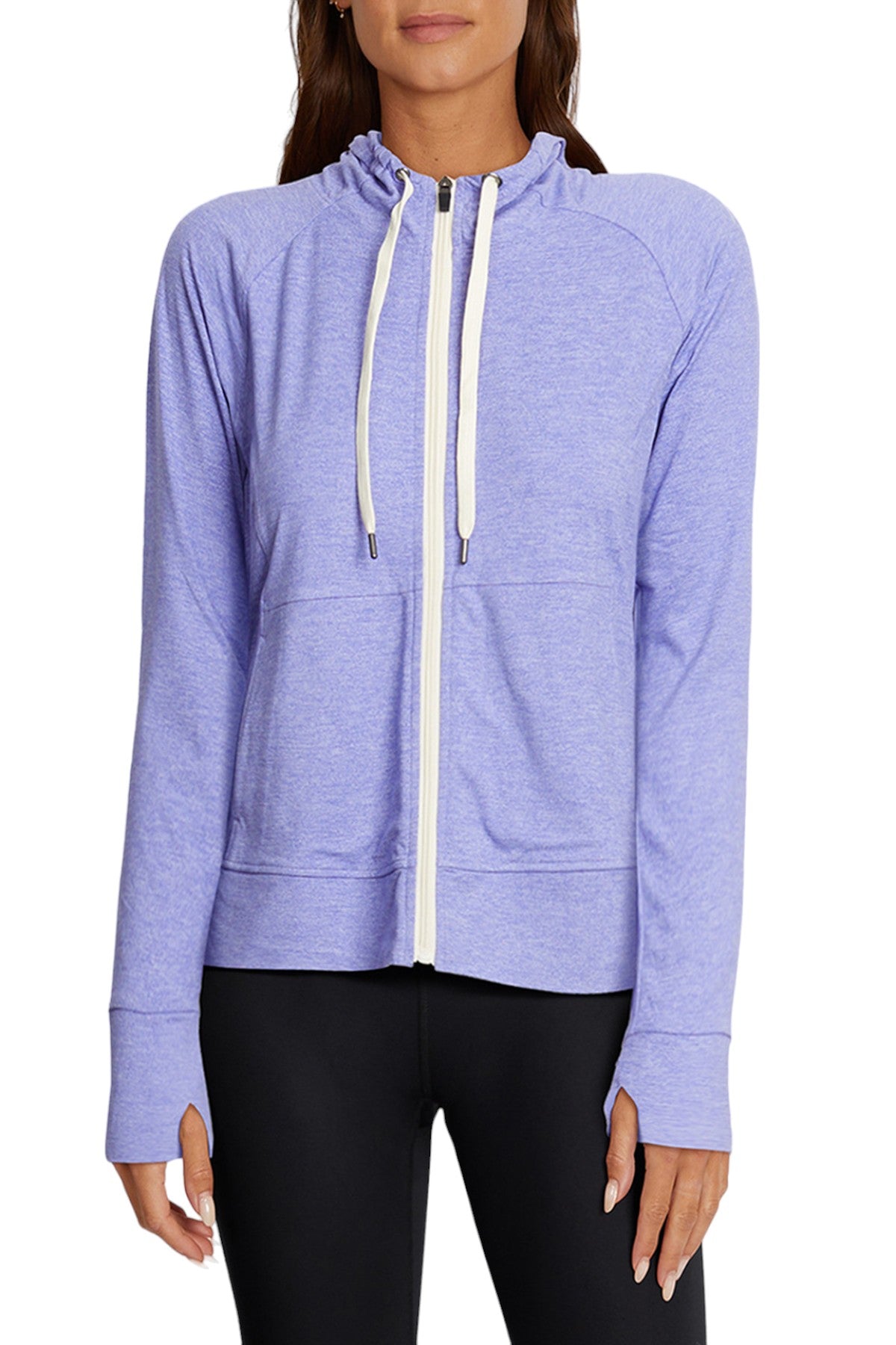 A slim-fit style for studio and street, this zip-front jacket is cut from heathered jersey, soft-brushed on both sides, with a functional drawcord hood, kangaroo pockets, and long sleeves with thumbholes.