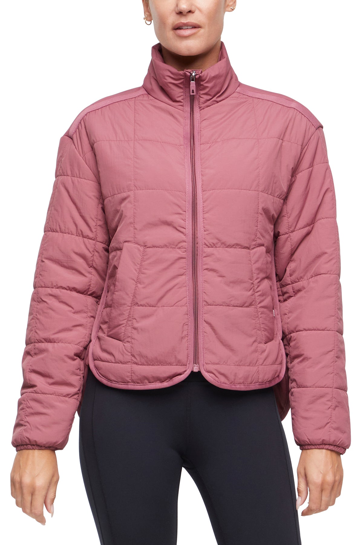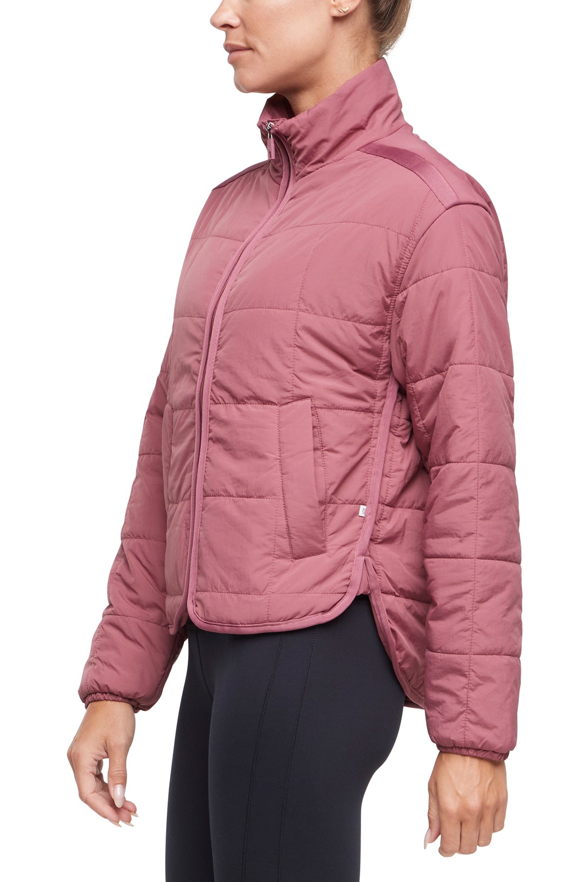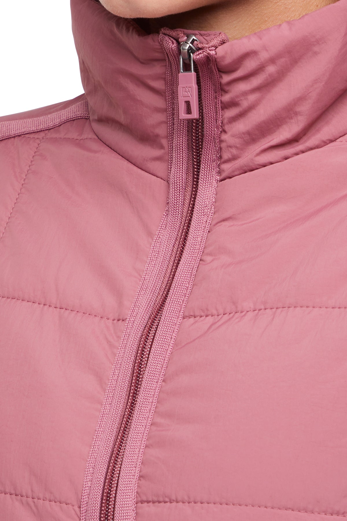 This lightweight quilted puffer features a mockneck silhouette with a full-length front zipper, long sleeves with stretchy cuffs, and side pockets to hold essentials or keep your hands warm.