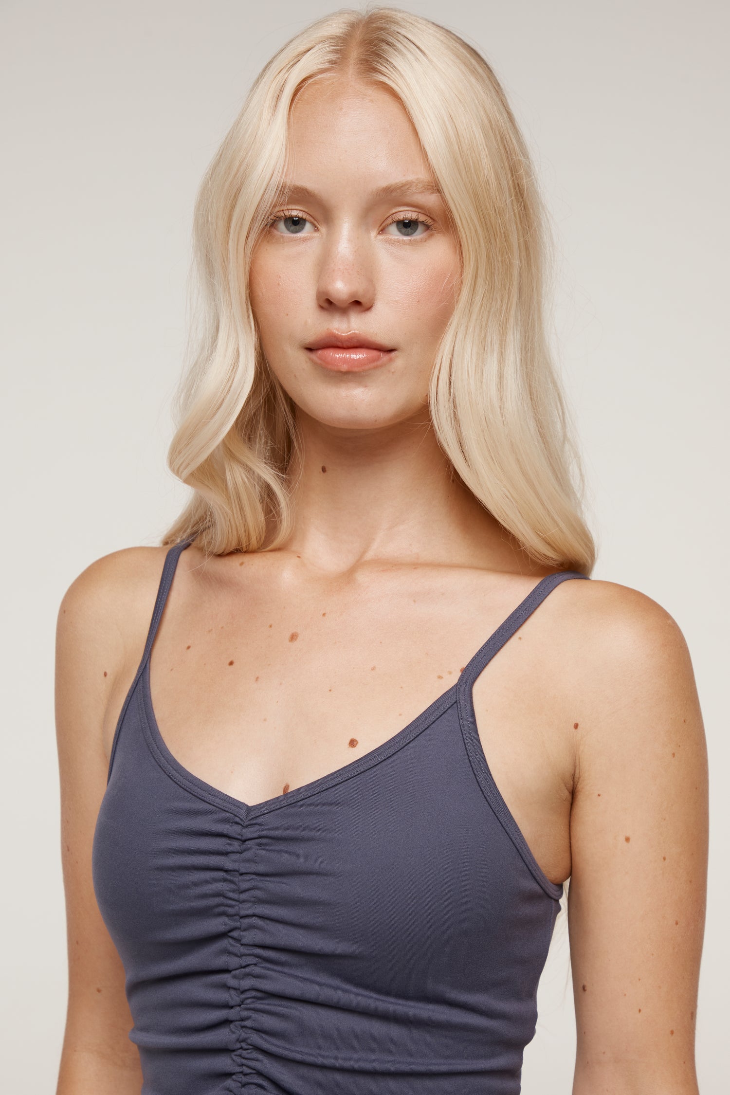 A studio-to-street style that resembles a cropped tank top, this long bra is cut from soft-brushed, sweat-wicking performance fabric, with ruched detailing on the front and a shelf lining inside for built-in support.