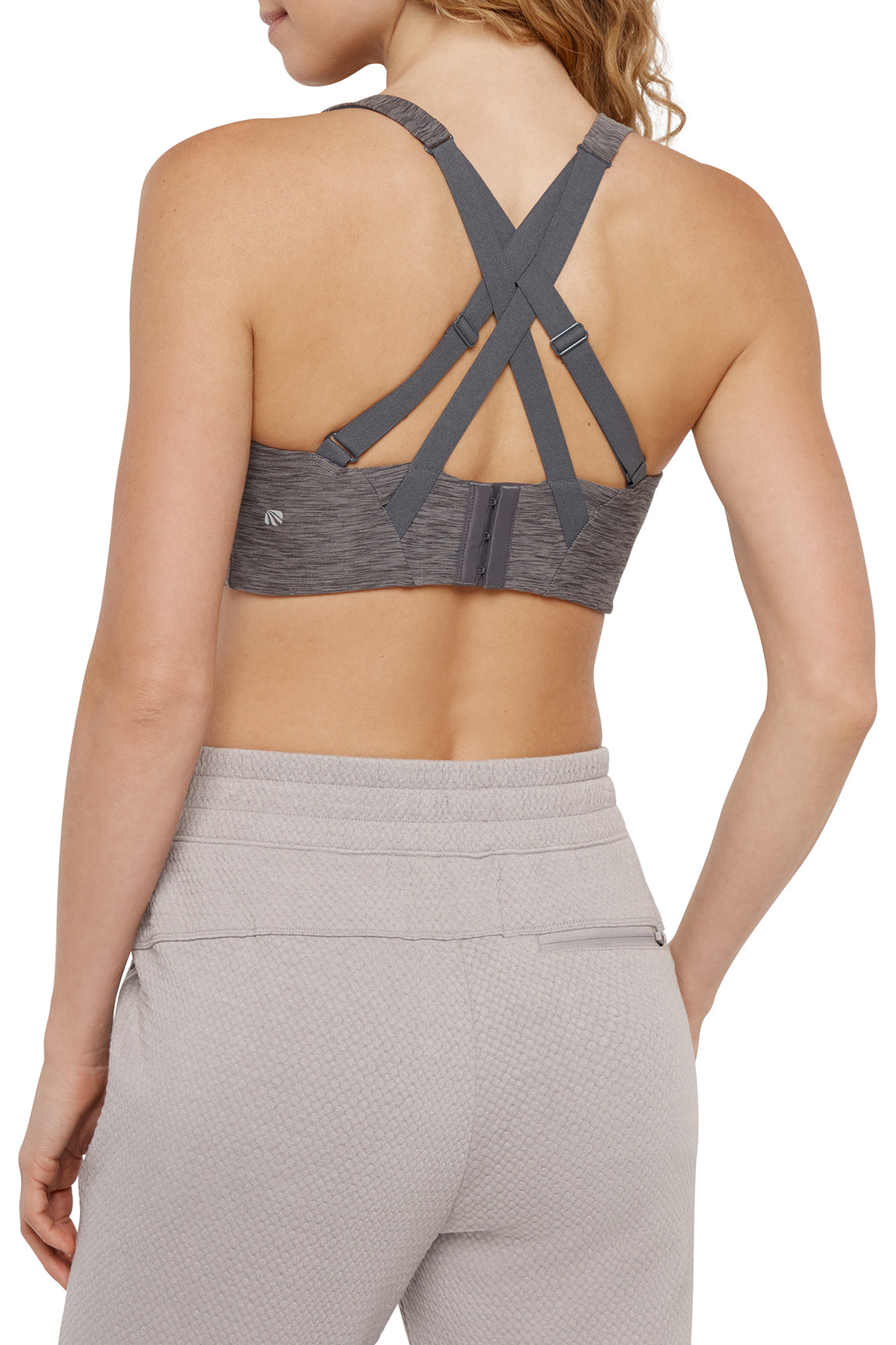 Soft-brushed, sweat-wicking, and so ready for action, this high-impact sports bra features molded, wire-free cups and a cut-out caged back, with adjustable crisscross straps and hook-and-eye closures.